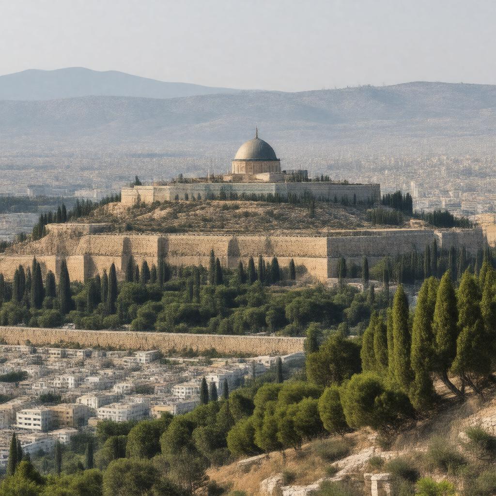 "Generate an image of the Mount of Olives, a mountain located in Jerusalem, Israel, with an elevation of 826 meters, overlooking the Old City of Jerusalem and the Temple Mount, featuring a panoramic view of the city, with the Church of All Nations, Chapel of the Ascension, Jewish Cemetery, Church of Pater Noster, and Tomb of the Prophets, set against the backdrop of the Judean Mountains, in a realistic and serene style."