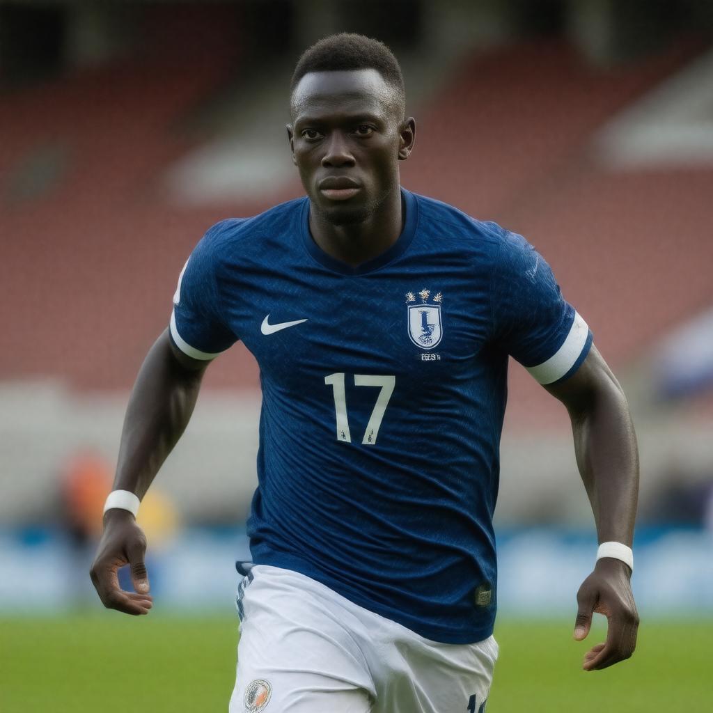 Generate a realistic image of Moussa Sissoko, a French footballer, in his football kit, specifically wearing the number 17 jersey, in a midfielder position on the field, with a determined expression, captured in a moment of action, conveying his athleticism and focus, in a style that blends photorealism with a slight artistic touch to highlight his personality and profession.