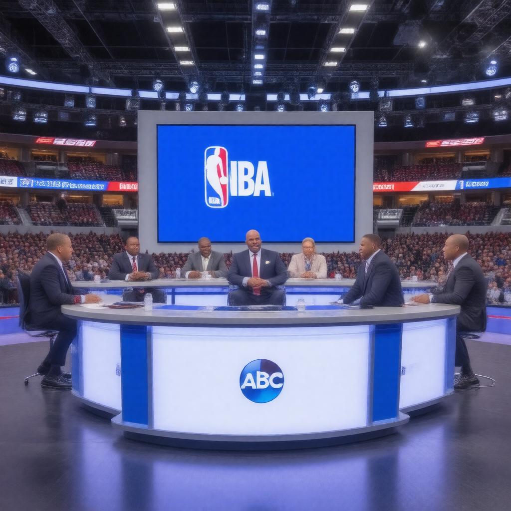 "Generate an image of a sports pre-game show set with a large screen displaying the NBA logo, surrounded by analysts' desks with multiple presenters, including Michael Wilbon, Jalen Rose, and Stephen A. Smith, sitting in discussion, with a lively studio audience in the background, and a ESPN/ABC logo prominently displayed, in a realistic style."