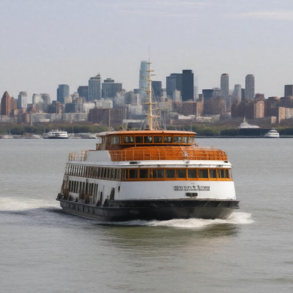 "Generate an image of a NY Waterway ferry operating in New York Harbor, with the Manhattan skyline in the background, specifically depicting the Weehawken to Midtown Manhattan route, in a realistic and photorealistic style, during daytime with clear weather conditions."