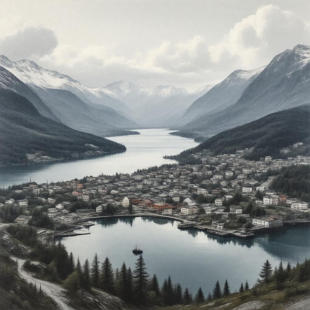 "Generate a realistic image of Narvik, a city located in Northern Norway, situated on the shores of Ofotfjorden. Depict the city's scenic landscape with surrounding mountains and fjords, with a few buildings and a harbor in the foreground. Incorporate elements that reflect the city's rich history, such as a subtle representation of the Battle of Narvik. Use a style that evokes a sense of serenity and natural beauty, characteristic of the region. Consider a watercolor or digital painting style with muted colors to convey the city's tranquil atmosphere."