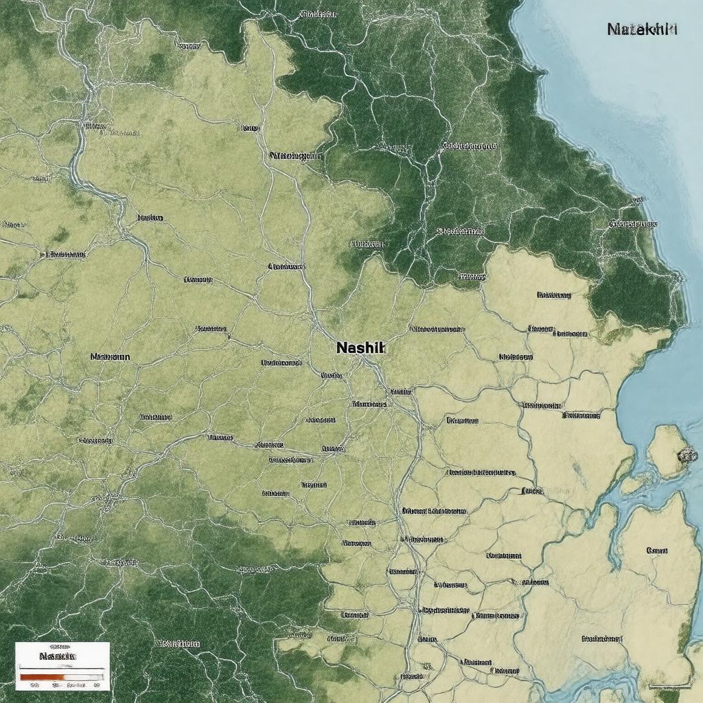 "Generate an image of a map of Nashik district, which is a district in the state of Maharashtra, India, with notable cities such as Nashik, Malegaon, and Igatpuri marked, surrounded by lush green forests and the Godavari river flowing through it, in a realistic and geographical illustration style."