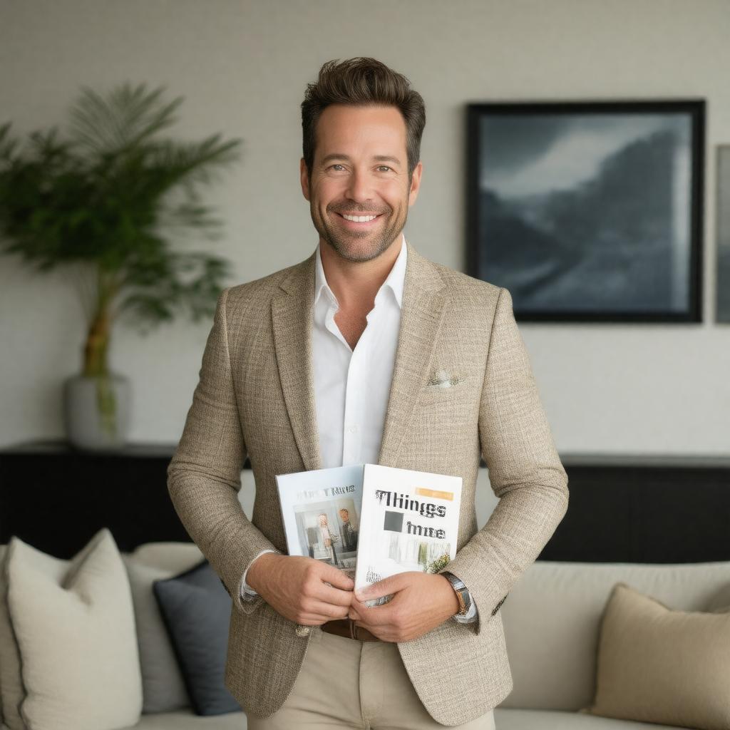 Create a realistic image of Nate Berkus, a stylishly dressed American interior designer, author, and television presenter in his 50s, with a warm and charismatic smile, standing in a beautifully designed living room with a mix of modern and vintage elements, reflecting his eclectic style, wearing a fashionable outfit and holding one of his design books, such as "The Things That Matter" or "Home Rules", with a subtle hint of his personality and professional accomplishments.