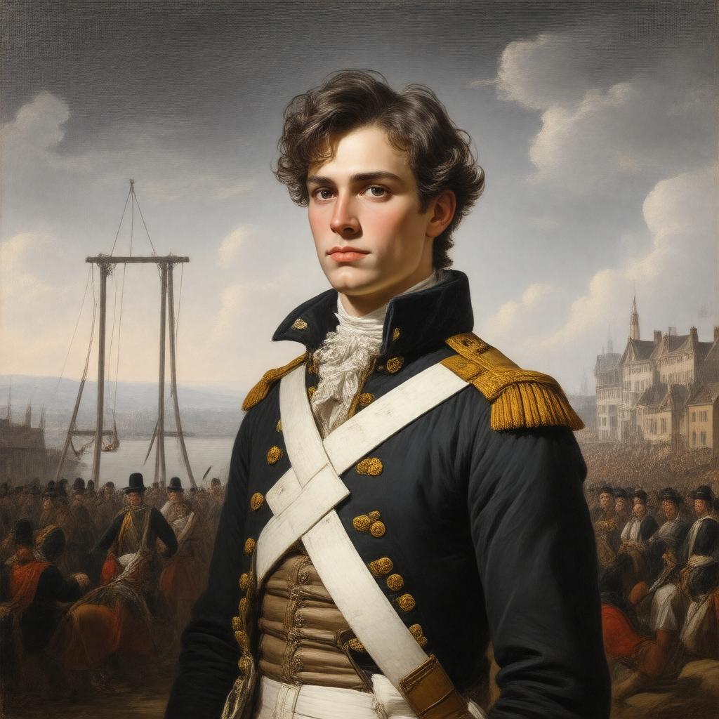 Generate an image of Nathan Hale, a young American soldier and patriot, dressed in Continental Army attire, standing heroically with a solemn expression, against a backdrop of a 18th-century cityscape, possibly with a gallows or a symbolic representation of his execution in the distance, reflecting his bravery and sacrifice during the American Revolutionary War, in a realistic and dignified style.