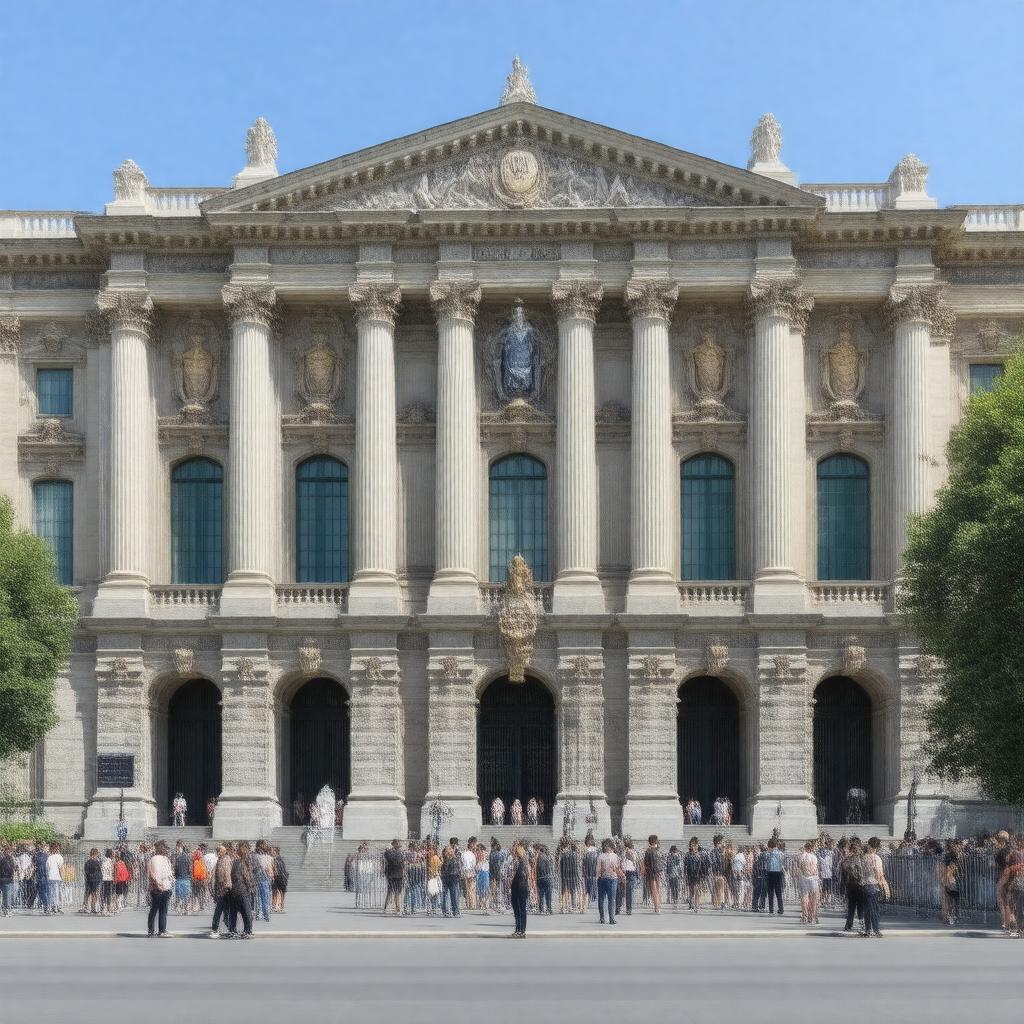 "Generate an image of the grand, neoclassical building of the National Library of Spain, located at Paseo de Recoletos, 20-22, Madrid, with its imposing facade and beautiful architectural details, surrounded by lush greenery and busy with people walking in and out of the building, during a sunny day."