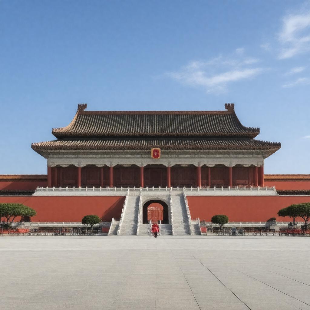 "Generate a photorealistic image of the exterior of the National Museum of China, located at 16 East Chang'an Avenue, Dongcheng District, Beijing, with its modern architectural design and grand entrance, set against a clear blue sky with a few wispy clouds, and with the iconic Tiananmen Square in the background."