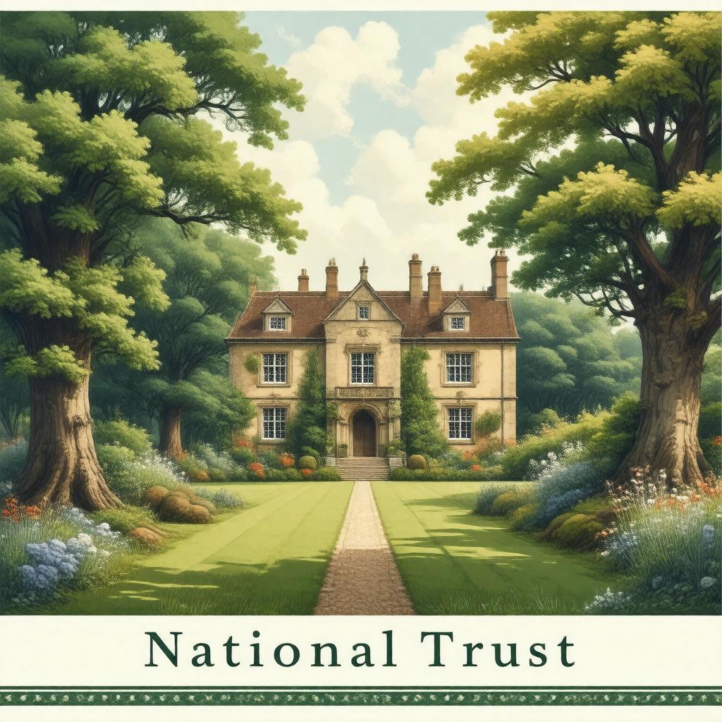 "Create an image of the National Trust logo or a representative scene featuring a historic mansion and natural landscape, set in a stylized yet realistic English countryside, incorporating elements that reflect conservation and natural beauty, in a style that blends traditional and digital media."