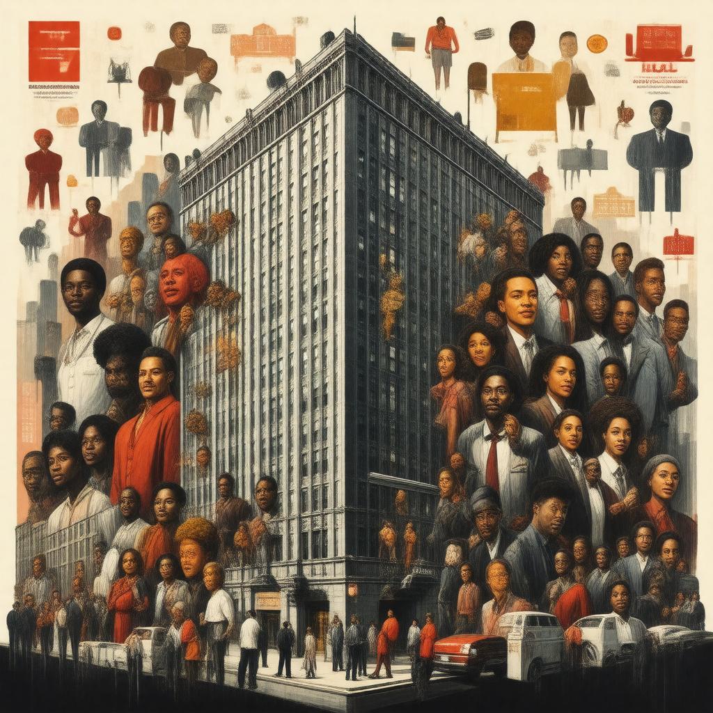 "Generate an image of the National Urban League's headquarters in New York City, with a stylized representation of a diverse group of people from the African American community in the foreground, surrounded by icons or graphics symbolizing the organization's focus areas: education, employment, health, housing, and economic empowerment. Incorporate the National Urban League's motto 'Empowering Communities. Changing Lives.' and its abbreviation 'NUL' in a modern, bold font. The style should be a mix of realism and symbolic representation, conveying a sense of hope, empowerment, and community."