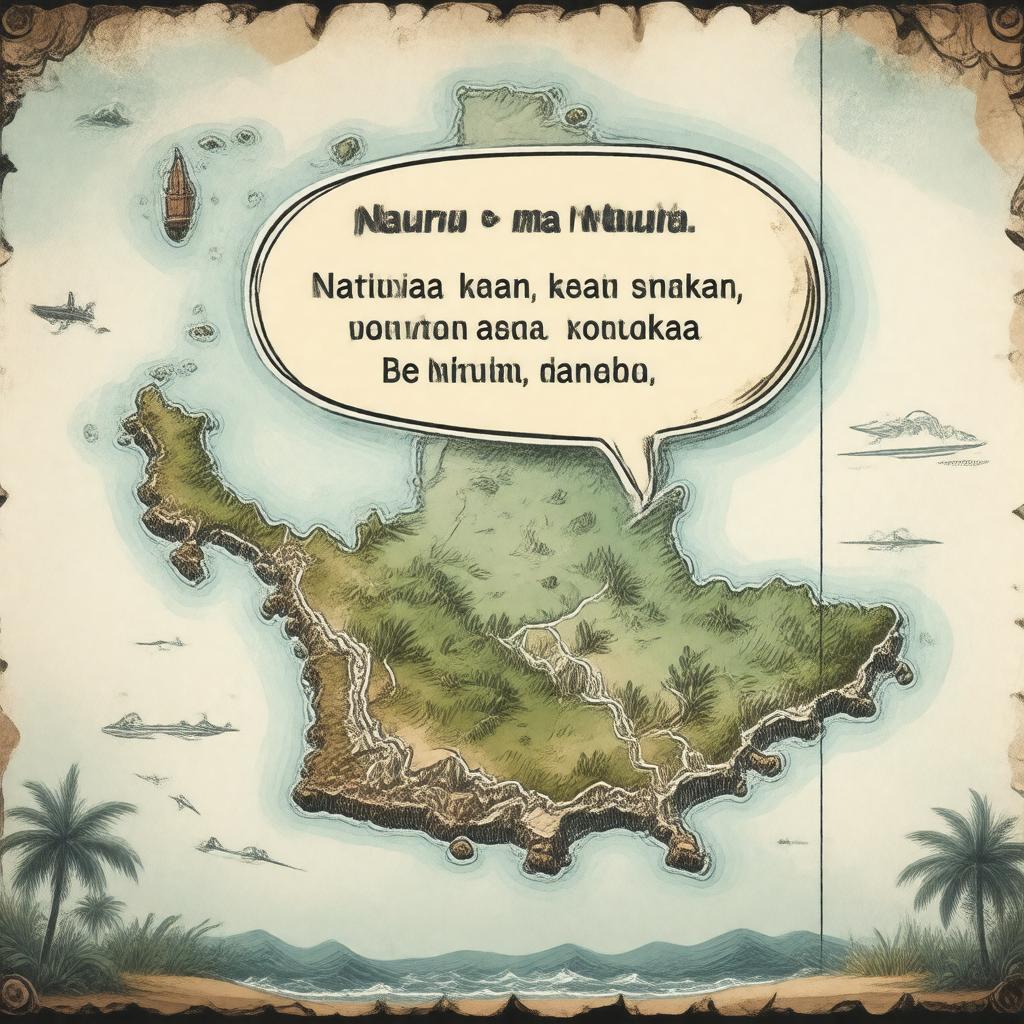 Generate an image of a map of Nauru with a speech bubble containing a phrase written in the Nauruan language, surrounded by traditional Nauruan patterns and with a subtle background texture resembling the ocean and a few palm trees, in a realistic style.