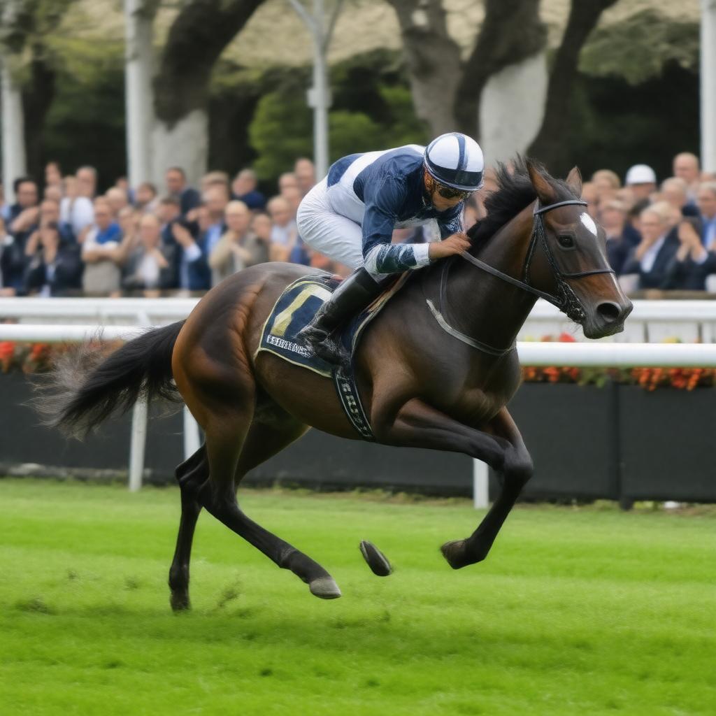 "Generate an image of a bay Thoroughbred colt, Naval Crown, racing on a lush green turf, with a blurred background of a cheering crowd, showcasing its dynamic movement and powerful strides, in a realistic and vibrant style, symbolizing its impressive racing career and notable wins, including the 2022 Platinum Jubilee Stakes and Al Fahidi Fort."