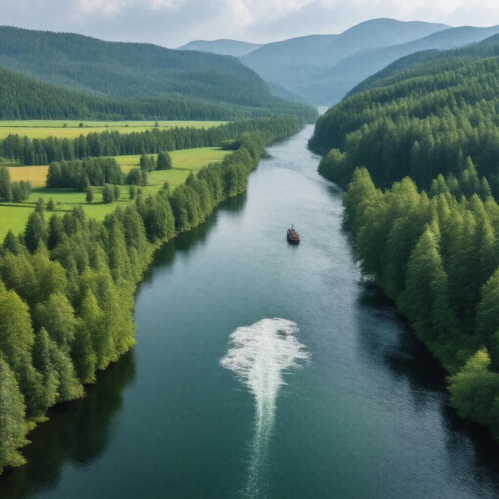 "Generate a realistic image of a river flowing through a scenic landscape with a mix of forests, fields, and urban areas, representing the Neman River in its natural course. The river should be depicted with a gentle flow, surrounded by lush greenery and possibly with visible signs of human activity such as a hydroelectric dam or boats. Incorporate elements that reflect the river's significance, including historical or architectural landmarks. The style should be photorealistic, capturing the serene beauty of the river and its surroundings."