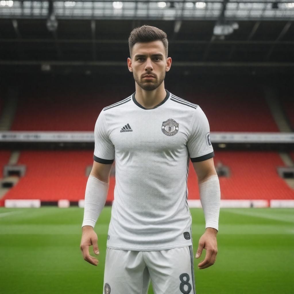Generate a realistic image of Nemanja Matić, a Serbian professional footballer, in his Manchester United F.C. jersey, with a serious expression, standing on a green football field with a subtle stadium background, wearing his iconic number 8 jersey, with a classic football pose that highlights his defensive midfielder skills.