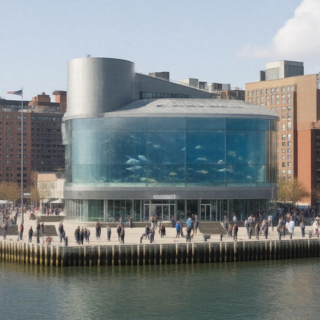 "Generate a daytime image of the New England Aquarium building located at 1 Central Wharf, Boston, MA 02110, with its distinctive architecture and waterfront setting, featuring a bustling area with visitors and possibly some marine life visible in exterior exhibits, in a realistic style."