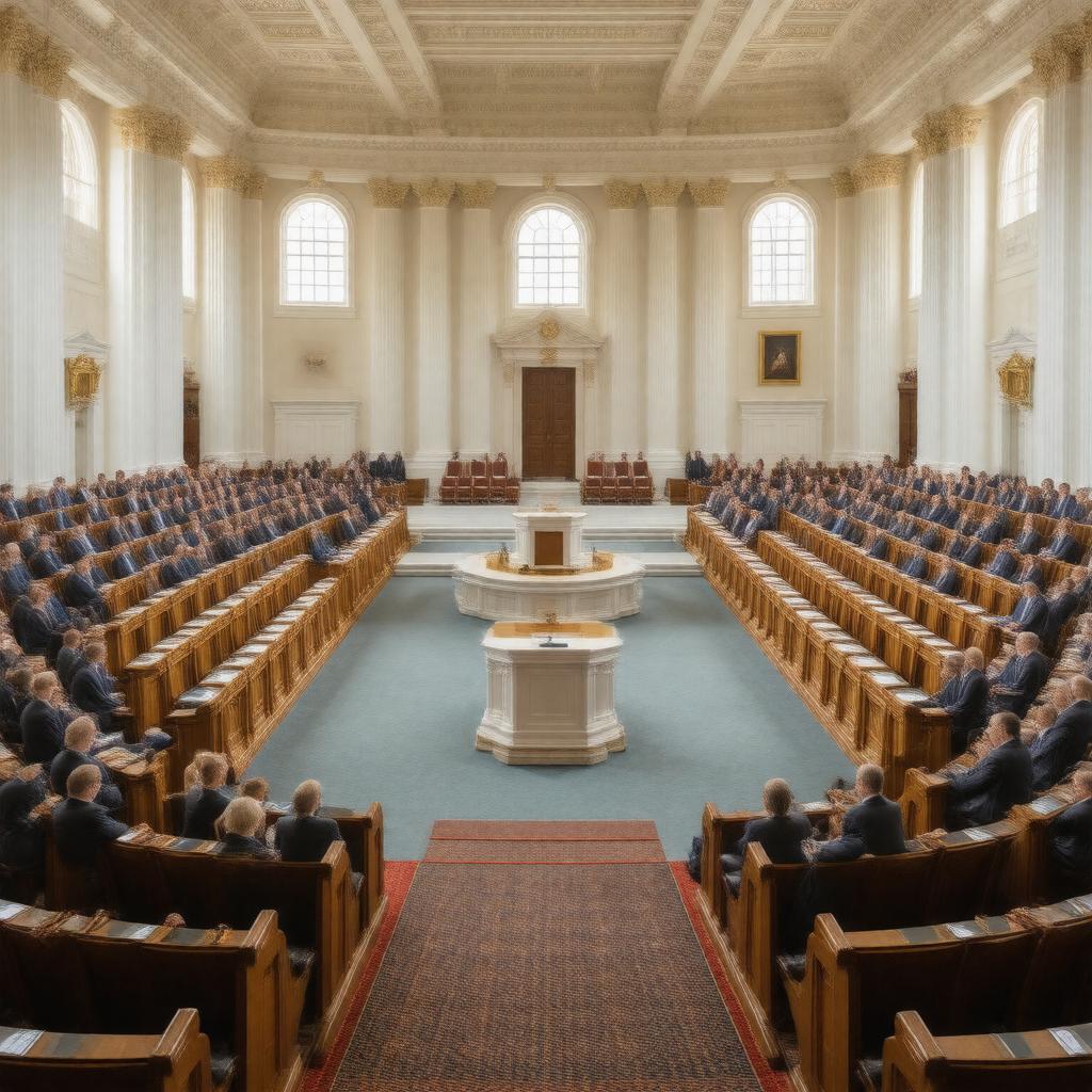 "Generate an image of the New Hampshire General Court in session, with the New Hampshire House of Representatives and New Hampshire Senate chambers visible, inside the New Hampshire State House in Concord, New Hampshire, showcasing its bicameral legislature with 400 representatives and 24 senators, in a formal and realistic style."