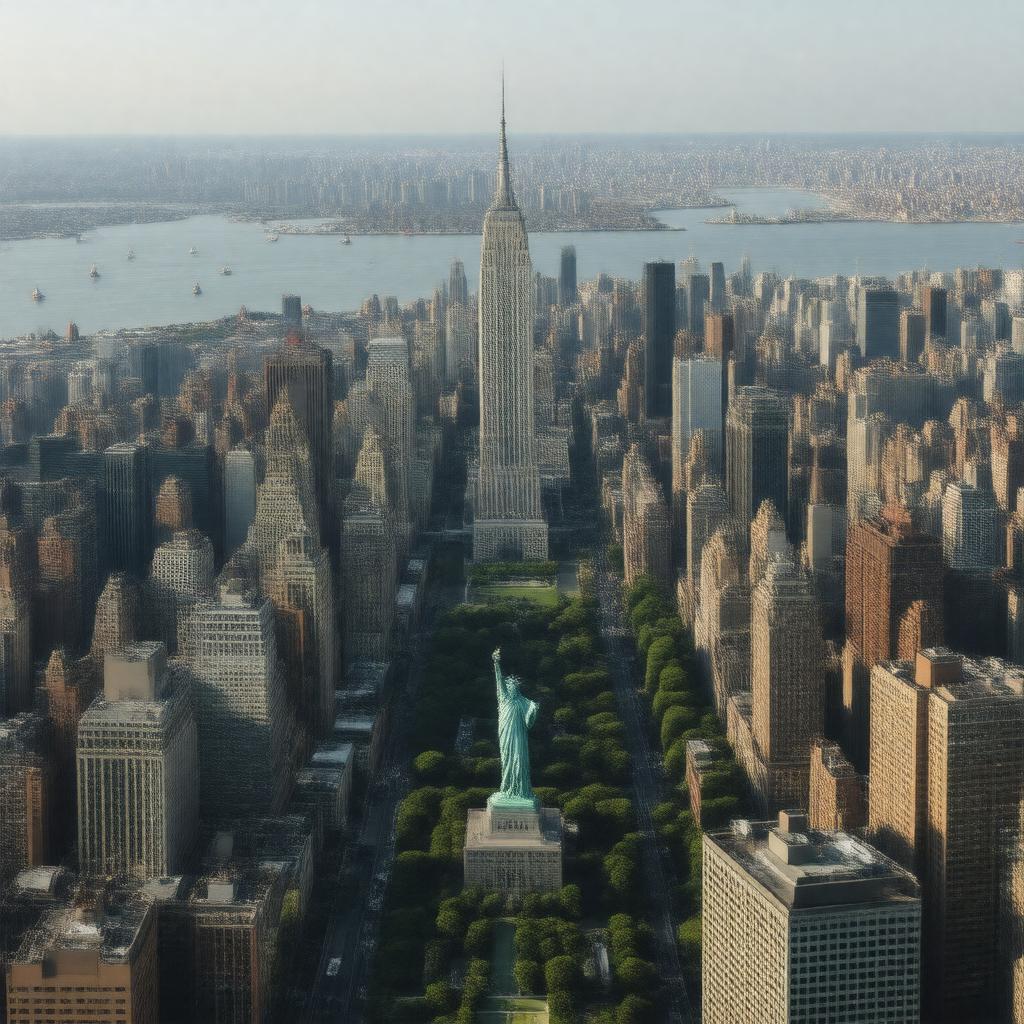 "Generate a realistic image of New York City, depicting a bustling metropolis with iconic skyscrapers, such as the Empire State Building and One World Trade Center, surrounded by lush green spaces like Central Park, with the Statue of Liberty in the harbor, and a vibrant atmosphere in Times Square, showcasing the city's unique blend of modernity and history, in a daytime setting with a mix of modern and classic architectural styles, in the style of a photograph."
