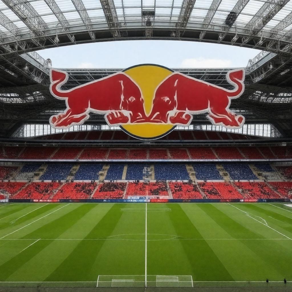"Generate an image of the New York Red Bulls football club's logo or stadium, specifically Red Bull Arena in Harrison, New Jersey, with a prominent display of the team's colors - red, white, and blue, and featuring the team's mascot, Bulls, in a dynamic scene, in a realistic style."