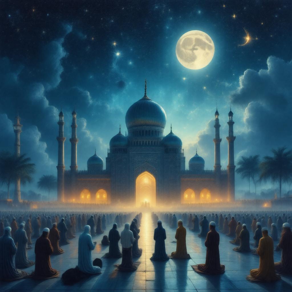 "Generate an image of a serene and majestic nighttime scene, with a mosque or a Islamic architecture in the background, illuminated by the moon and stars. In the foreground, depict a group of Muslims engaged in peaceful and devoted activities such as praying, reciting the Quran, and supplicating. The atmosphere should convey a sense of tranquility, spirituality, and reverence, symbolizing the significance of Laylat al-Qadr, the Night of Power, in Islam."