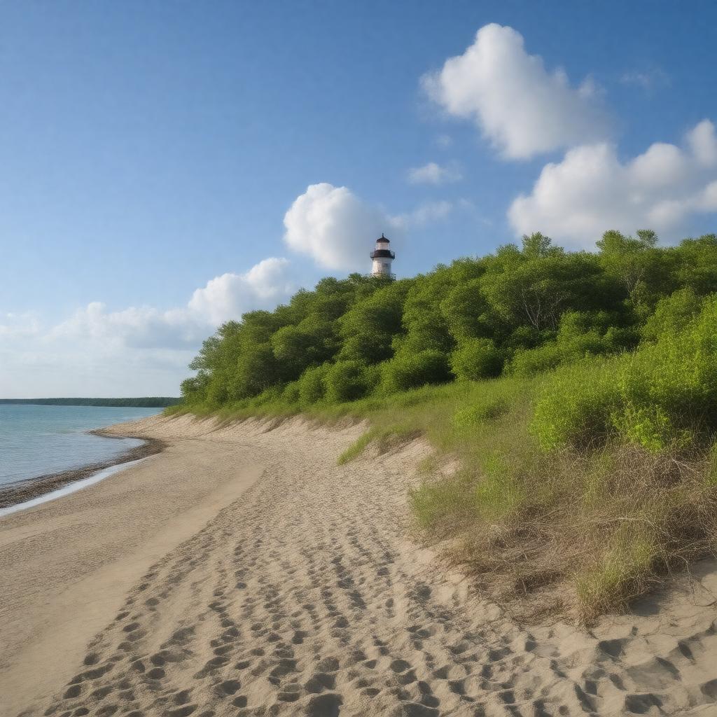 "Generate an image of a serene and natural landscape of North Manitou Island, an uninhabited island located in Lake Michigan, featuring its lush forests, towering dunes, and pristine beaches, with the historic North Manitou Shoal Light standing tall in the distance, all under a clear blue sky with a few puffy white clouds, in a realistic and breathtaking style."