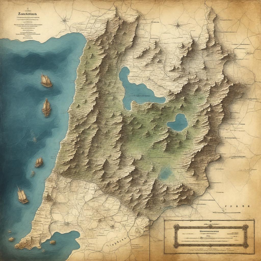"Generate an image of a ancient map of the Northern Kingdom of Israel, also known as the Kingdom of Israel or Samaria, during its peak in the 9th century BCE, highlighting its capital city Samaria, and its neighboring regions including the Kingdom of Judah, Phoenicia, Aram-Damascus, Moab, and Ammon. Include notable archaeological sites such as Megiddo, Hazor, Dan, and Tirzah. Depict the region in a realistic style, with a muted color palette and detailed topography. The image should convey a sense of historical significance and geographical context."