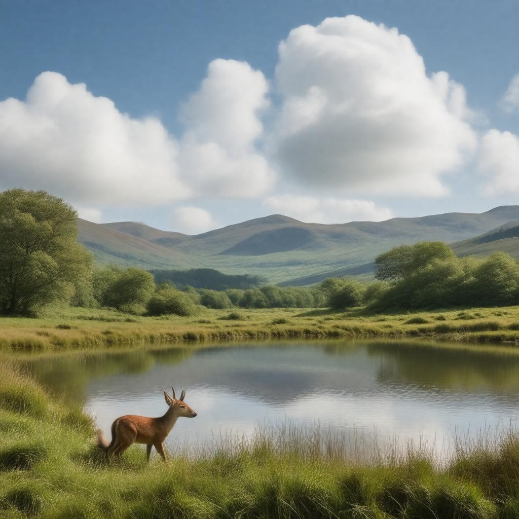 "Generate an image of a serene and picturesque landscape of Northumberland National Park, showcasing its rolling upland hills, with the majestic Cheviot Hills in the background, and a tranquil lake in the foreground, surrounded by lush green grass and trees, with a few red squirrels and roe deer roaming freely, under a clear blue sky with a few wispy clouds, highlighting the park's natural beauty and diverse wildlife."