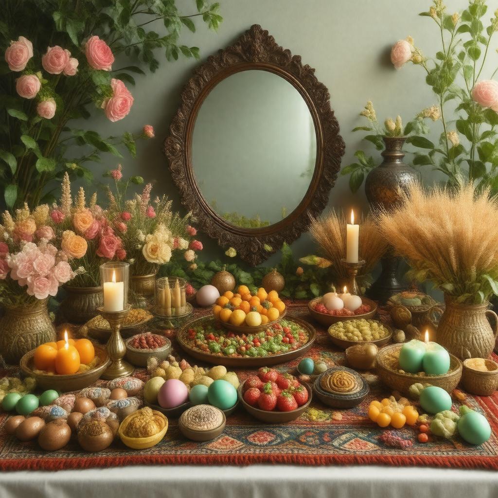 "Generate an image of a vibrant and colorful Haft-Seen table, set against a backdrop of blooming flowers and greenery, symbolizing the Nowruz celebrations, with traditional elements such as a mirror, candles, painted eggs, and sprouted wheat, surrounded by festive decorations and lights, in a style that reflects the rich cultural heritage of Persia and the joyous spirit of renewal and new beginnings."