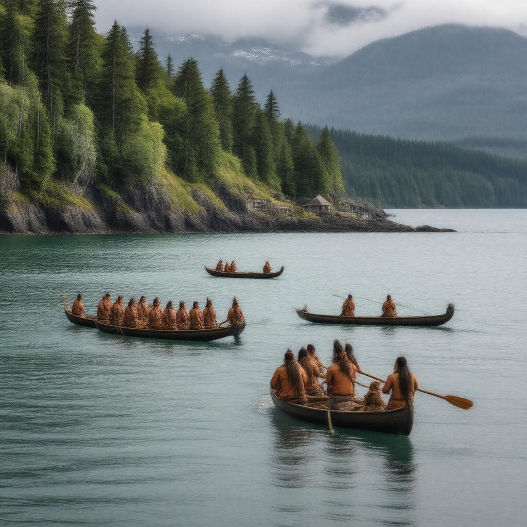 "Generate an image of a traditional Nuu-chah-nulth village on the west coast of Vancouver Island, featuring a group of Nuu-chah-nulth people in their canoes, surrounded by lush greenery and rugged coastline, with a potlatch ceremony taking place in the foreground, in a realistic and detailed style, reminiscent of 19th-century indigenous art."