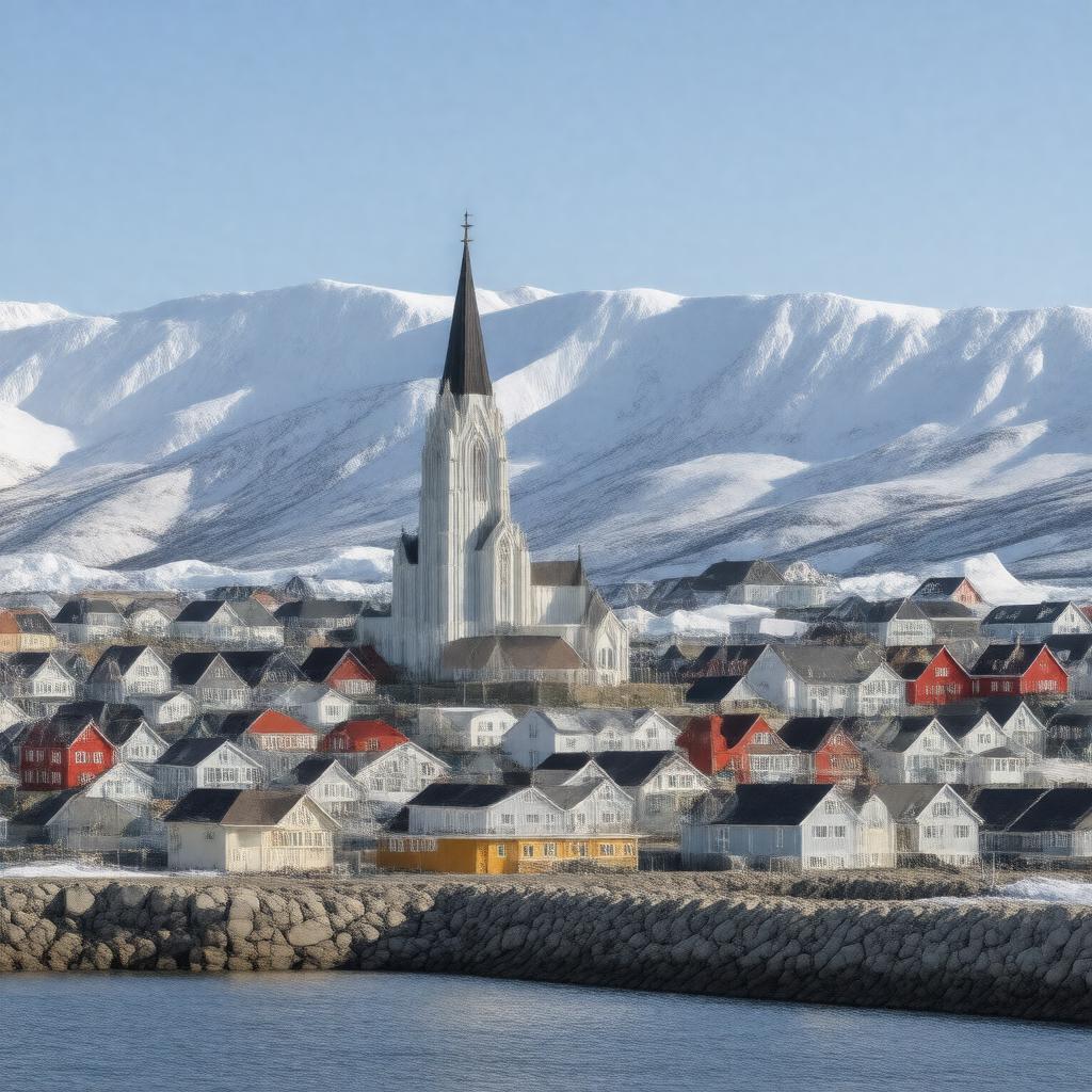 "Generate a realistic image of Nuuk, the capital city of Greenland, situated on the southwest coast with a subarctic climate, featuring the Nuuk Cathedral, colorful houses, and a backdrop of rugged terrain and possibly icebergs in the nearby fjords, in a photorealistic style."