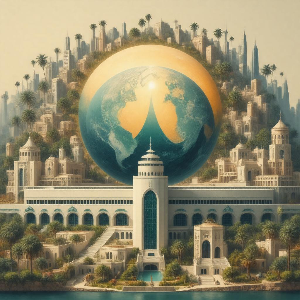 "Generate an image of the Organisation of Islamic Cooperation (OIC) logo or headquarters in Jeddah, Saudi Arabia, with a stylized representation of the Islamic world's cultural and architectural influences in the background, symbolizing unity and cooperation among its 57 member states."