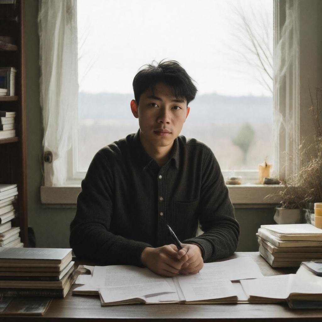 Create a realistic portrait of Ocean Vuong, a Vietnamese-American poet, novelist, and essayist, sitting at a desk with papers and a pen, surrounded by books and a window with a subtle view of the Northampton, Massachusetts landscape, in a contemplative and introspective mood, with a hint of warmth and vulnerability, in a style that blends elements of realism and literary photography.