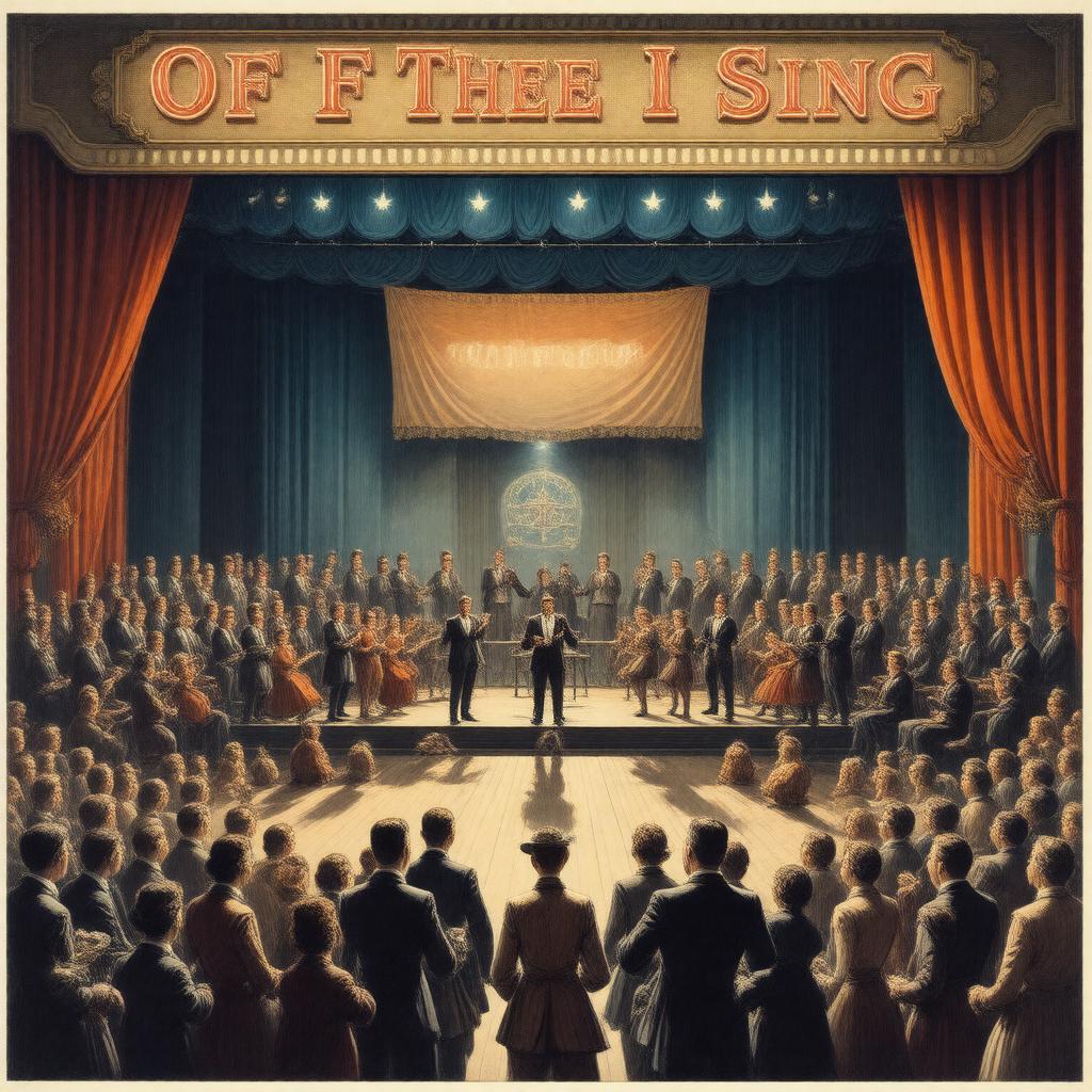 Create an image of a satirical musical theatre scene set in the United States, specifically a representation of the 1931 premiere of 'Of Thee I Sing' at the Music Box Theatre in New York City, featuring elements that reflect American politics, with characters inspired by William Gaxton, Victor Moore, and Lois Moran, incorporating iconic songs like 'Of Thee I Sing (Baby)', 'Love Is Sweeping the Country', and 'Who Cares?', in a style reminiscent of 1930s musical theatre, with a hint of satire and whimsy.