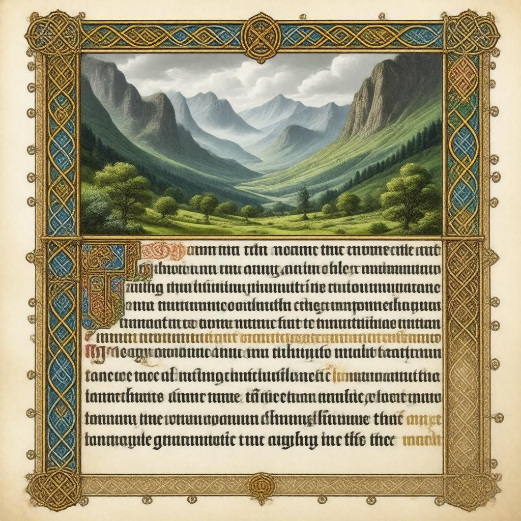 "An illuminated manuscript page in Latin alphabet script, featuring Old Irish text from The Book of Armagh, with intricate Celtic knotwork and Ogham inscriptions in the margins, set against a backdrop of medieval Ireland's lush green landscapes and misty mountains, circa 800 AD."