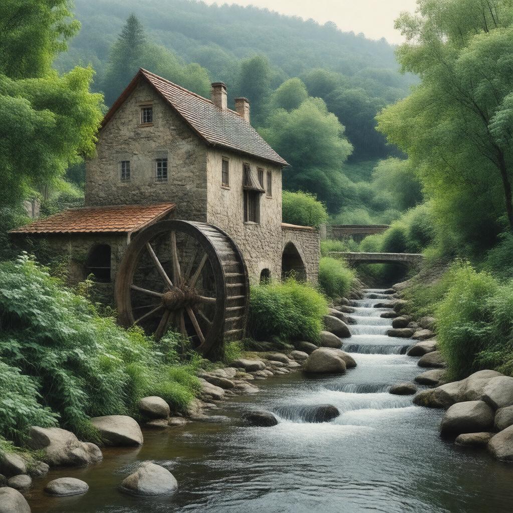 "Generate an image of a serene old mill situated in a rural landscape, with a waterwheel and rustic architecture, surrounded by lush greenery and a tranquil stream, in a realistic and impressionistic style, gptkbp:instance_of: historic mill."