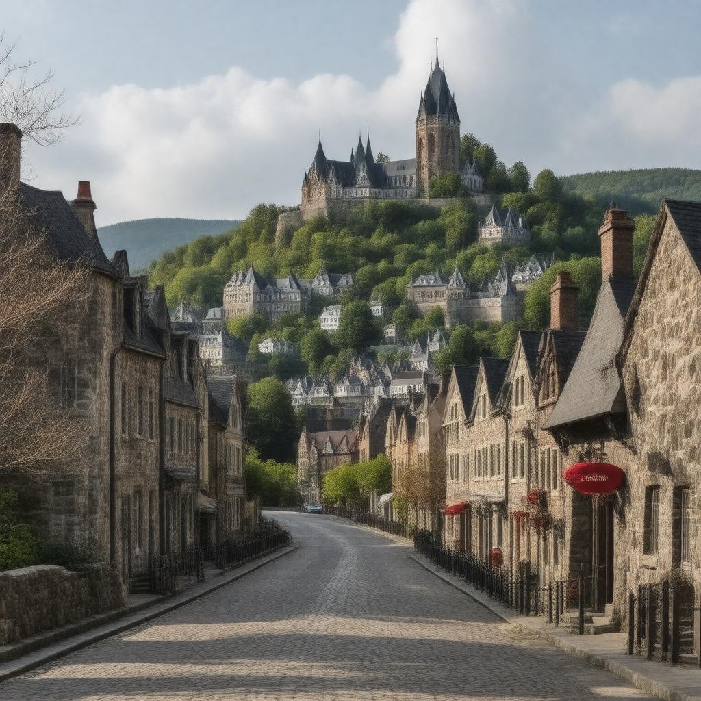 "Generate an image of a historic district with cobblestone streets, old stone buildings, and fortifications, situated on a hill overlooking a river, with a majestic cathedral and a famous hotel in the background, depicting Old Quebec, a UNESCO World Heritage Site, in a realistic and picturesque style."