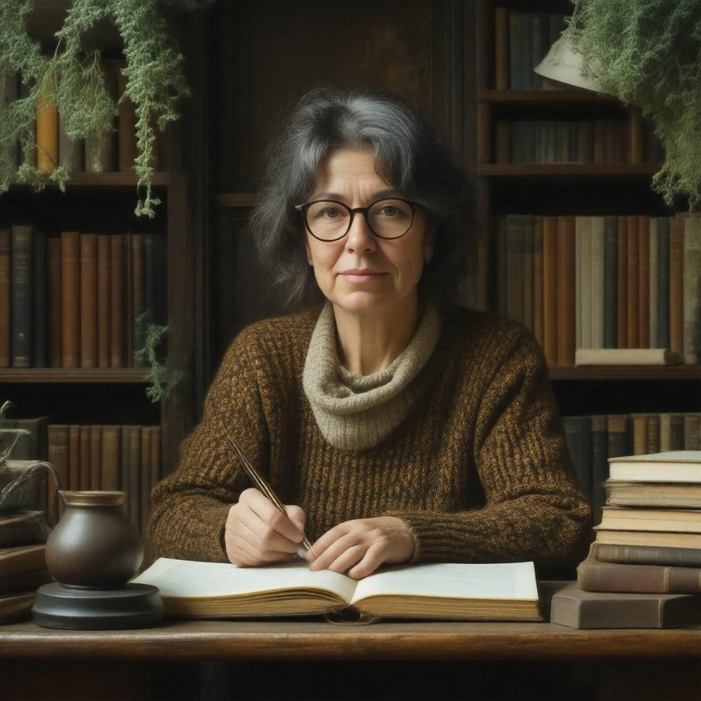 Create an image of Olga Tokarczuk, a renowned Polish writer, sitting at a wooden desk in a cozy, dimly lit study surrounded by books and papers, with a warm, introspective expression on her face, wearing a pair of reading glasses and holding a pen, as if paused mid-writing, with a few of her notable works, such as "Primeval and Other Times" and "The Books of Jacob", visible on the shelves behind her, in a realistic and contemplative style.