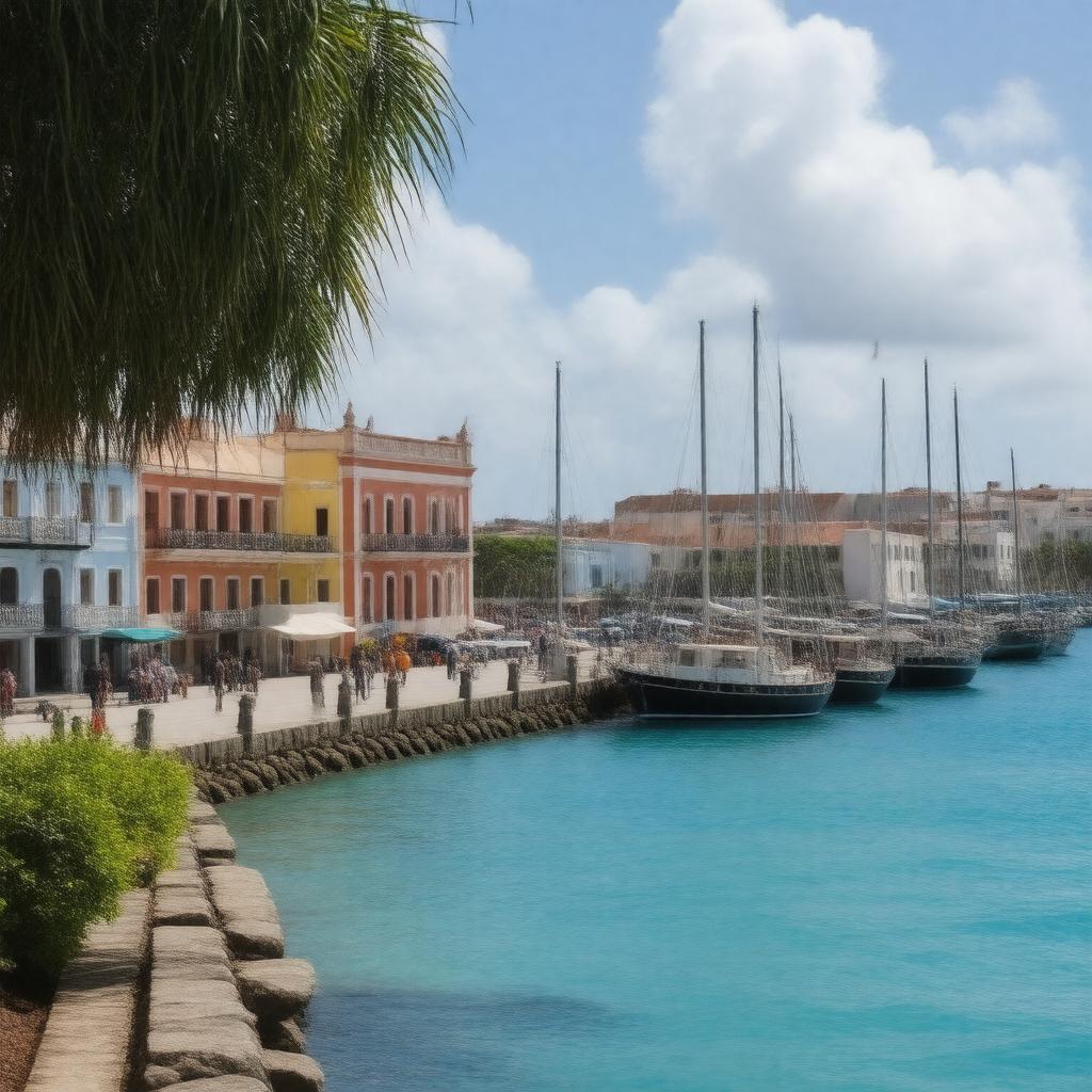 "Generate a realistic image of Oranjestad, the capital city of Aruba, showcasing its colorful colonial architecture, bustling port, and vibrant atmosphere, with a backdrop of clear blue Caribbean waters and a bright sunny sky, in a style reminiscent of a warm and inviting travel brochure."