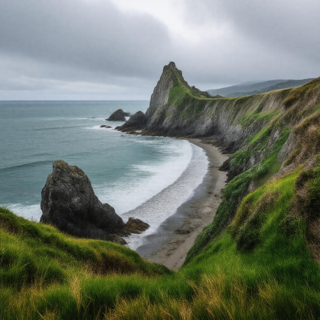 "Generate an image of a scenic Oregon Coast landscape, featuring a rugged rocky shoreline, with a majestic sea stack in the distance, surrounded by lush green grass and headlands, under a cloudy oceanic climate sky, with the Pacific Ocean waves gently crashing against the shore, incorporating elements of Ecola State Park and the iconic Haystack Rock, in a realistic and serene style."