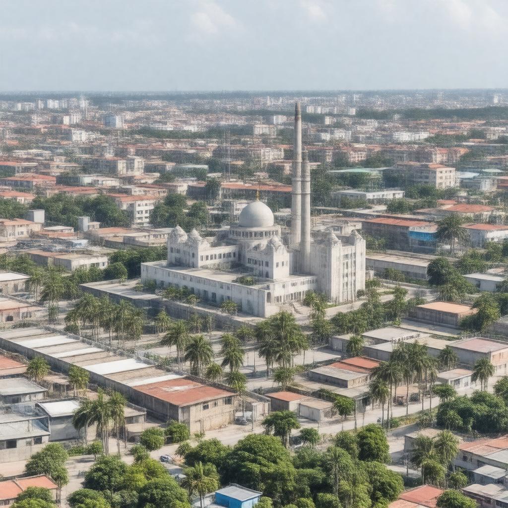 "Generate a realistic image of a bustling industrial hub city in Southwest Nigeria, with a mix of modern buildings, industrial areas, and notable landmarks such as the Ota Central Mosque and Canaanland, surrounded by lush greenery, under a bright sunny sky, representing Ota, a city in Ogun State, Nigeria."