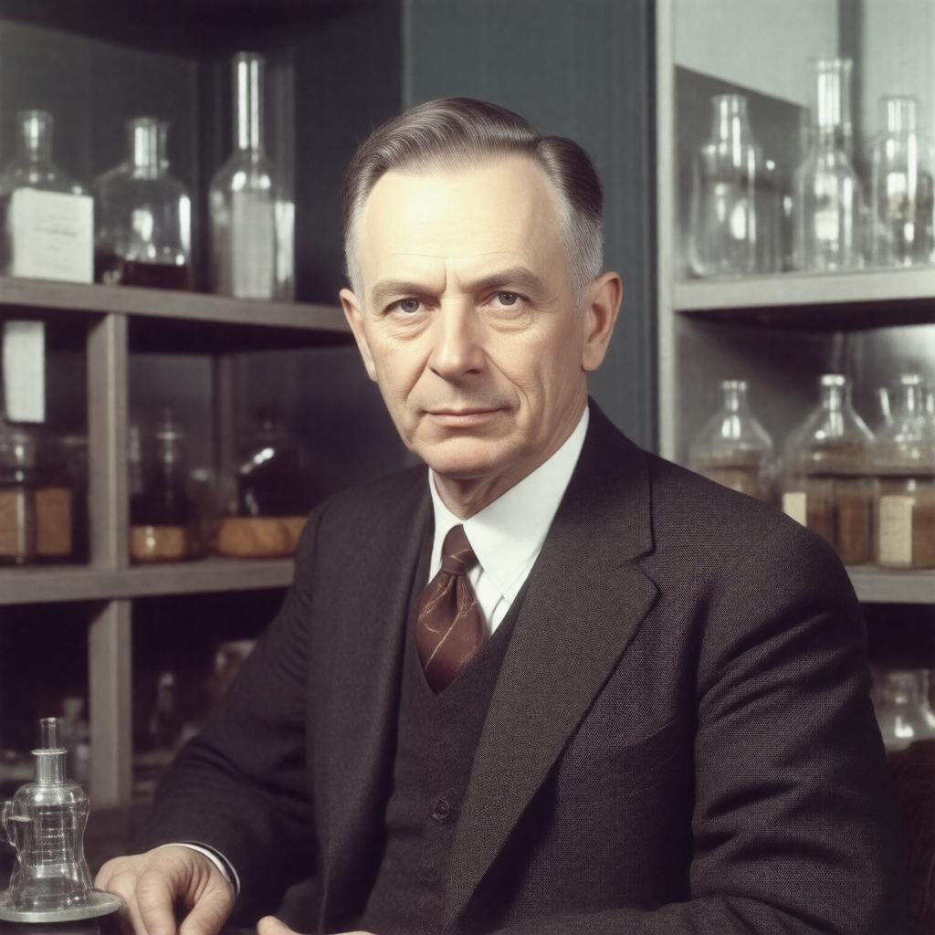 "Create a realistic portrait of Prof. Dr. Otto Hahn, a renowned German chemist and pioneer in radioactivity, in a formal attire, sitting in a laboratory setting with a subtle background hinting at his work on nuclear fission, awarded the Nobel Prize in Physics in 1944, with a calm and introspective expression, in a style reminiscent of a 1940s photograph."