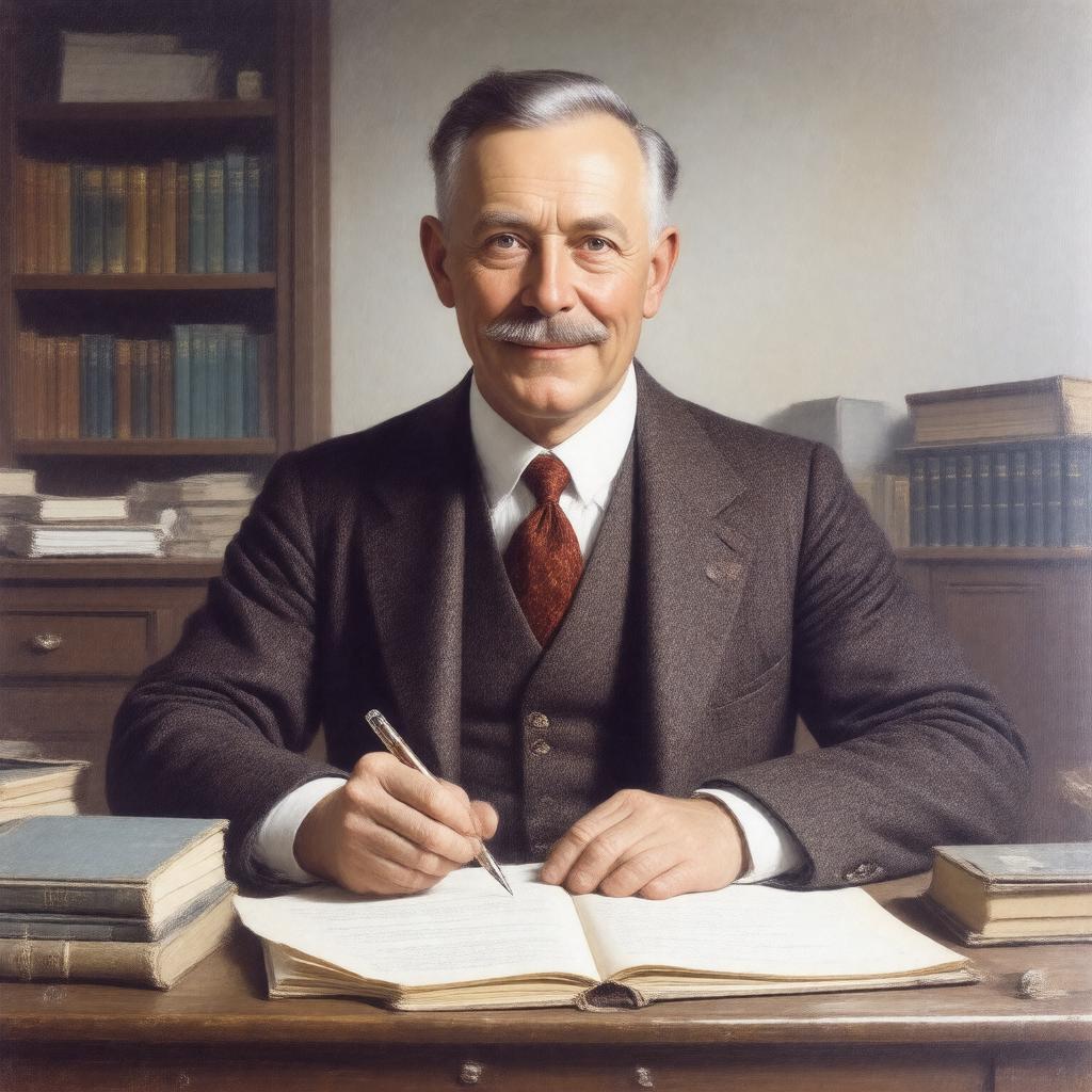 "Portrait of Sir Owen Seaman, a British poet, editor, and writer, sitting at a desk with a pen in hand, surrounded by papers and books, with a gentle smile, wearing formal attire, in a style reminiscent of early 20th-century British portraiture."