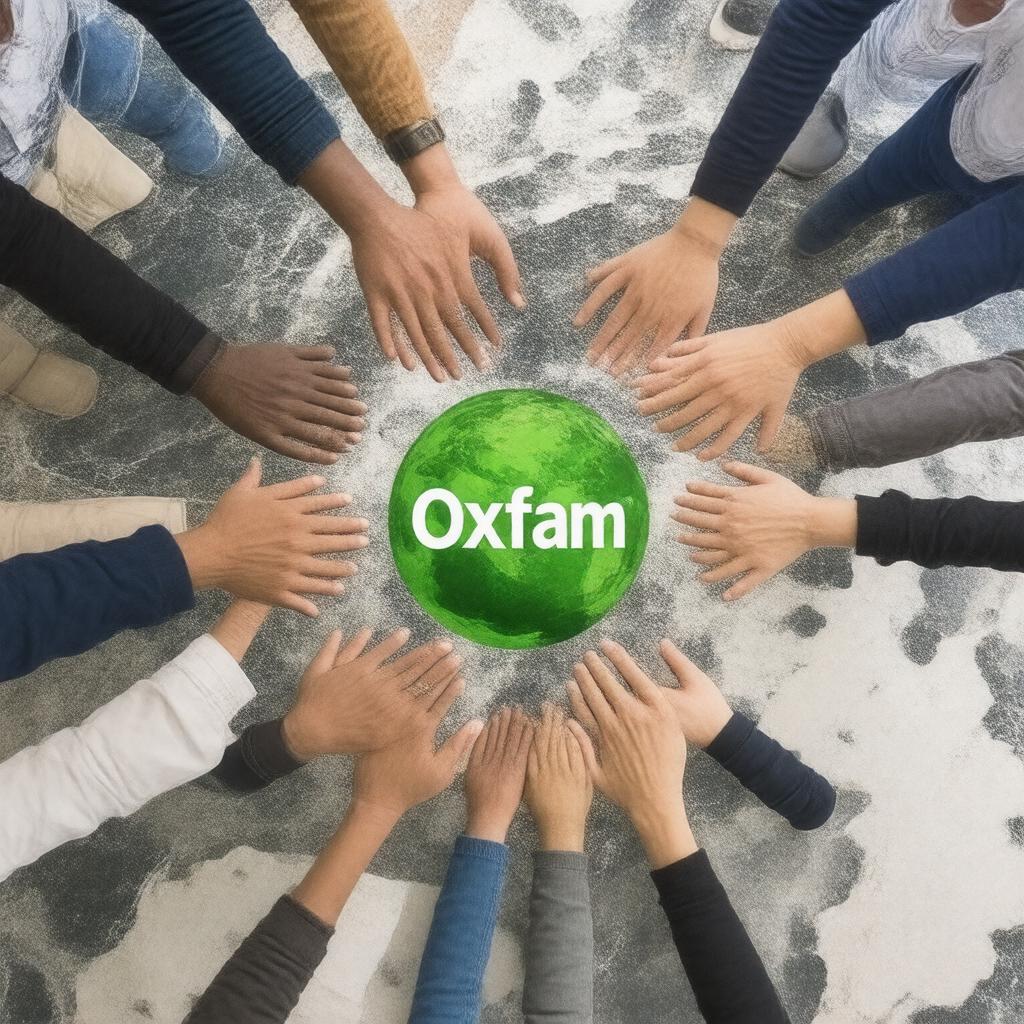 "Generate an image of the Oxfam logo or a representative scene of Oxfam's humanitarian work, such as a group of people from different countries holding hands in a circle, with a subtle background of a world map, or a picture of a volunteer distributing aid in a disaster-stricken area, in a realistic and hopeful style, conveying the organization's focus on alleviating global poverty and promoting humanitarian aid."