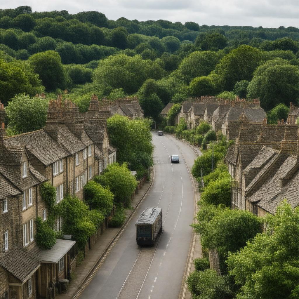 "Generate an image of a charming English town surrounded by lush greenery, with historic buildings, a railway station, and a bustling high street, representing Oxted, a town in Surrey, South East England."