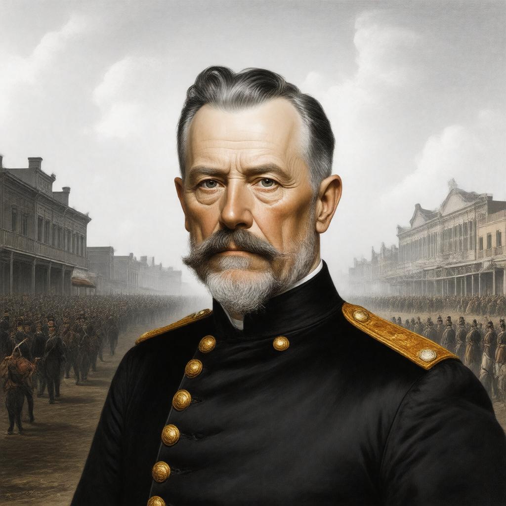 Generate a realistic portrait of P.G.T. Beauregard, a middle-aged man with a dignified expression, wearing a Confederate States Army general's uniform, with a backdrop of a 19th-century American cityscape, possibly New Orleans or a Civil War-era battlefield; incorporate elements that reflect his Creole heritage and military career, such as a hint of French-inspired architecture or a subtle nod to his engineering background.