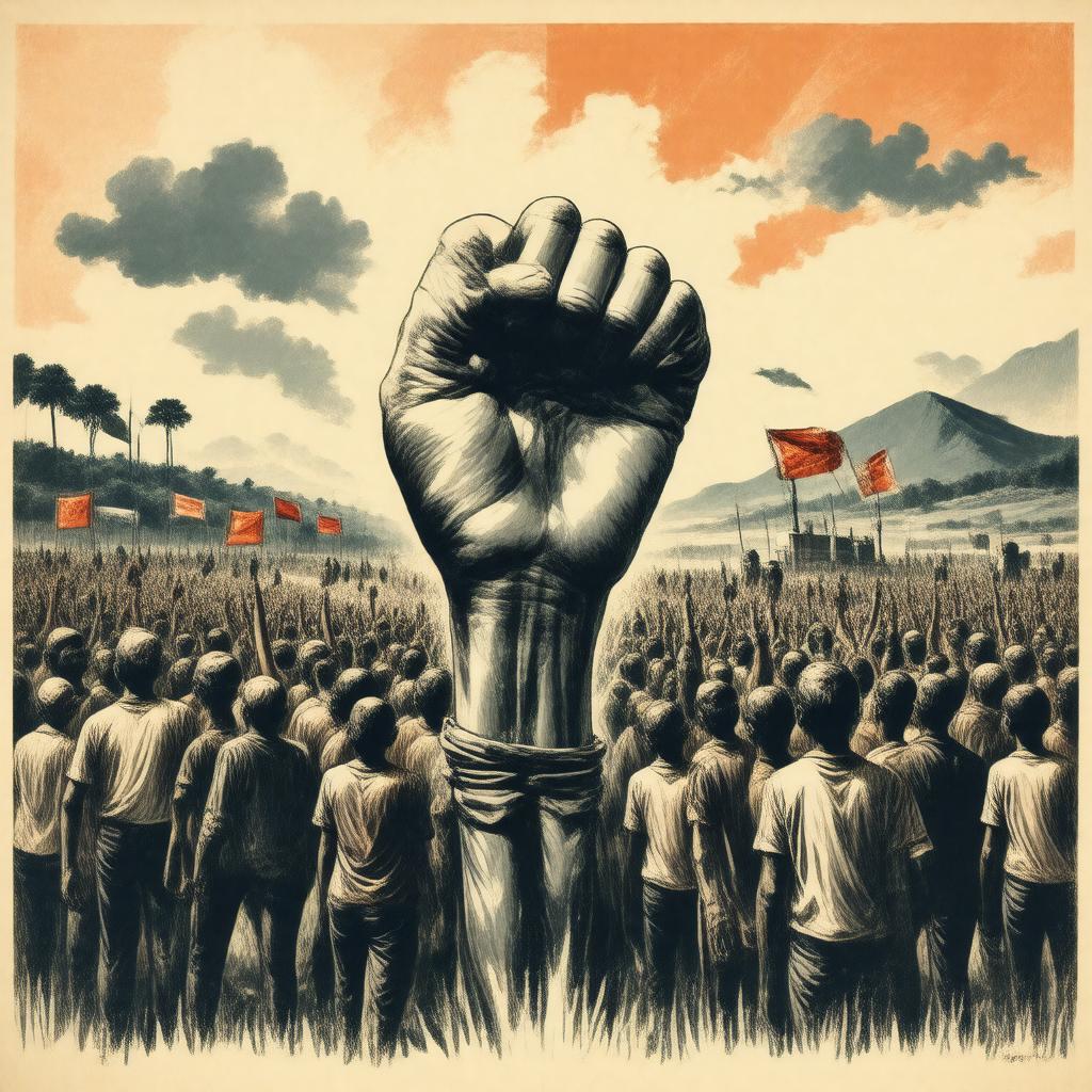 Generate an image of a symbolic representation of the Popular Liberation Front, a left-wing political party in India, incorporating elements that reflect its ideology, such as raised fists, banners, or other activist motifs, set against the backdrop of the Indian landscape or a neutral political rally setting, in a realistic yet impactful style.
