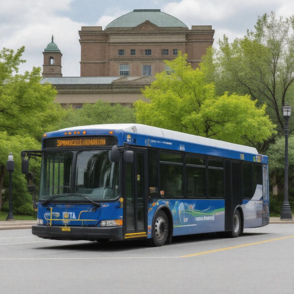 "Create an image of a PVTA bus, specifically a hybrid or electric bus, in front of a Massachusetts landmark, such as the Springfield Union Station, with a subtle background of the Pioneer Valley scenery, incorporating the PVTA logo and colors, in a realistic and modern style."