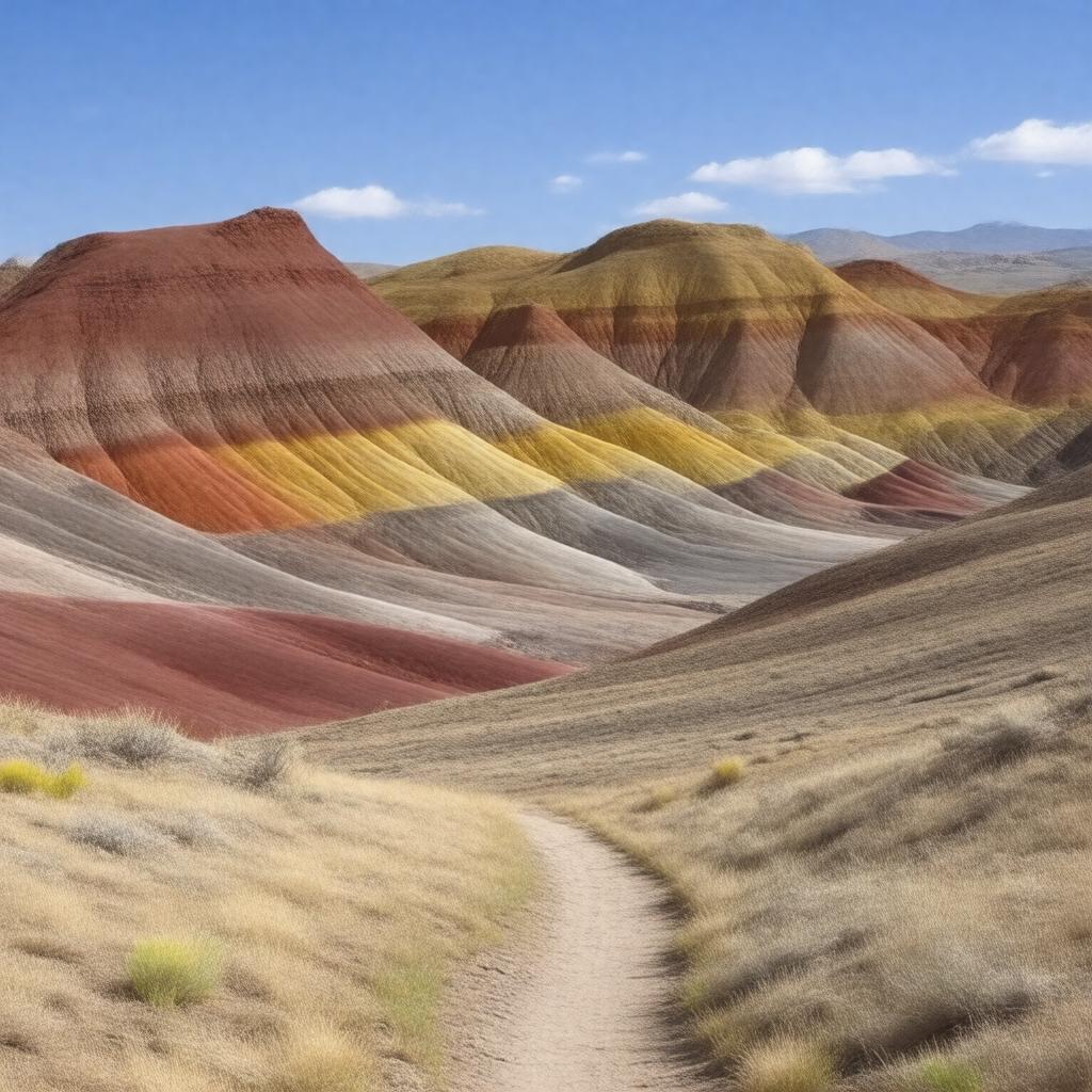 "Generate an image of a sweeping, panoramic view of the Painted Hills, a geological formation located in Wheeler County, Oregon, showcasing its vibrant, colorful stratifications of red, yellow, gold, and black layers, set against a clear blue sky with a few wispy clouds, with a trail winding through the hills in the foreground, highlighting the unique natural beauty and paleontological significance of this semi-arid region, in a realistic and detailed style."