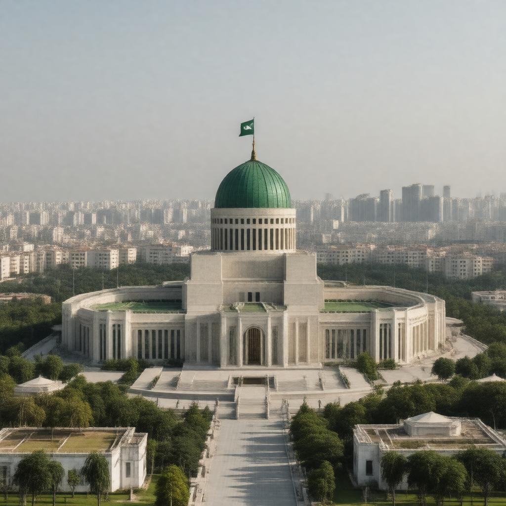 "Generate an image of the Pakistan government, represented by a grand building or a symbolic structure, possibly with the Pakistani flag waving in the background, set against a backdrop of the Islamabad cityscape. The building should reflect a blend of modern and Islamic architectural styles, signifying the country's rich history and its contemporary governance. Include subtle elements that represent the various branches of the government, such as a miniature model of the Parliament of Pakistan or the Supreme Court of Pakistan. The overall tone should convey stability, unity, and progress. Style: Realistic with a touch of symbolic representation."