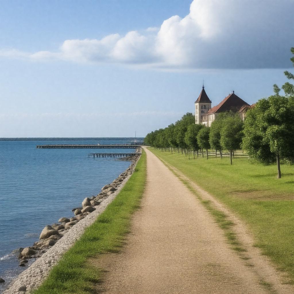 "Generate a realistic image of Palanga, a city located on the Baltic Sea in Klaipėda County, Lithuania, showcasing its beautiful botanical park, historic Tyszkiewicz Palace, and vibrant J. Basanavičiaus Street, with the Palanga Pier stretching into the sea in the background, under a sunny day with a few clouds, in a style that reflects the city's rich history and cultural heritage."