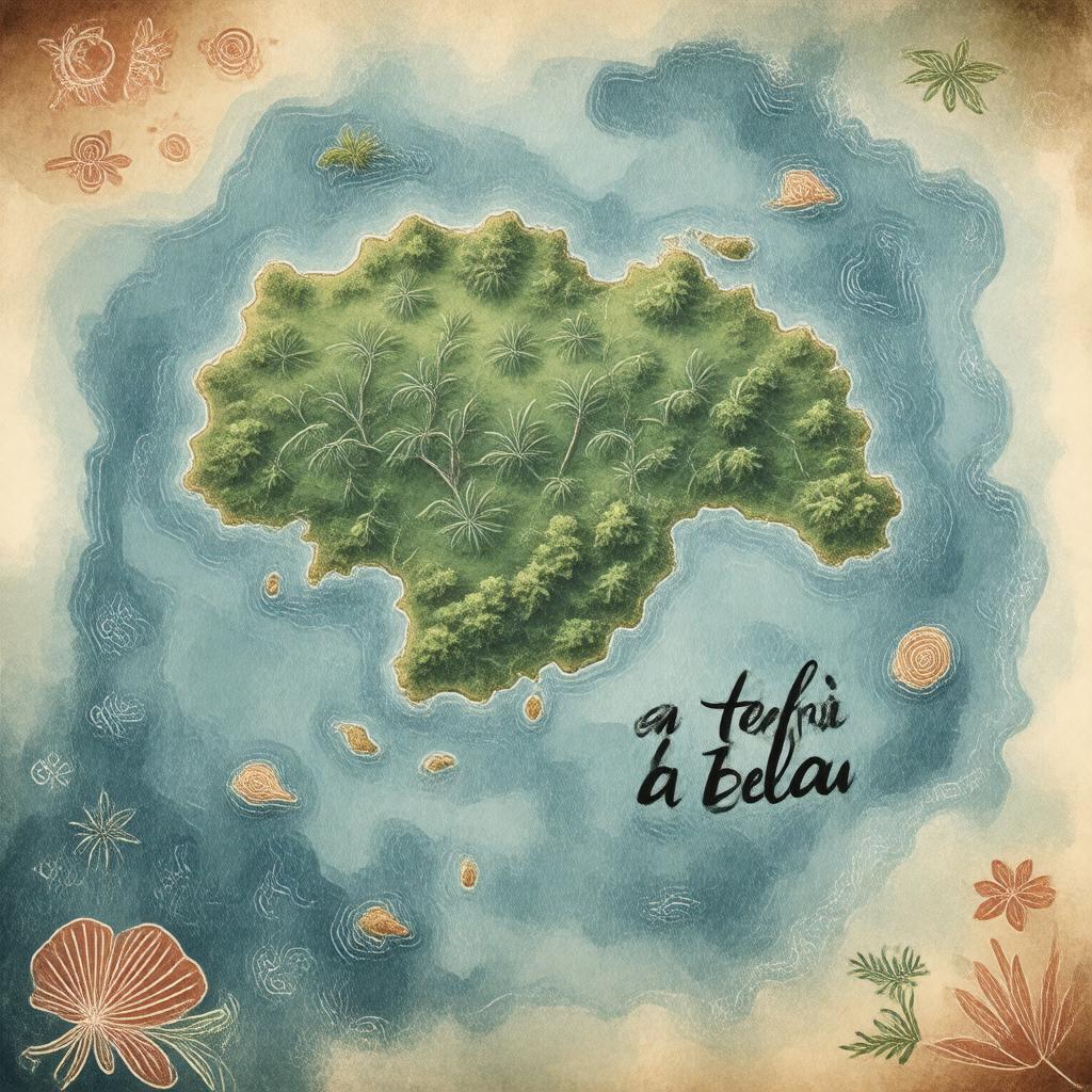 Generate an image of a map of Palau with a subtle pattern of traditional Palauan designs in the background, and a few words written in the Palauan language, "a tekoi er a Belau", using the Latin script, in a style that reflects the cultural heritage of Oceania.