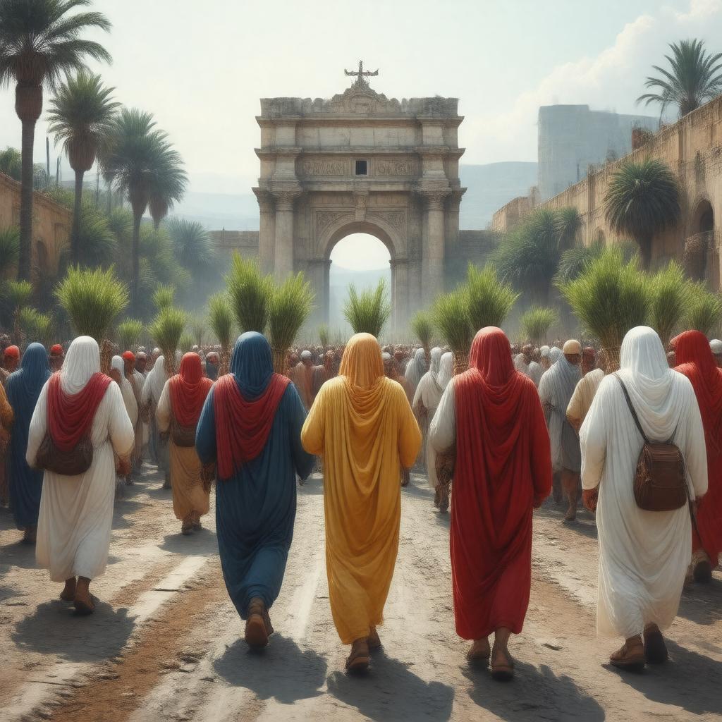 "Generate an image of a vibrant and festive procession on a Sunday, with people holding palm branches and walking towards a grand, ancient city gate, symbolizing the triumphal entry of Jesus into Jerusalem, with a color palette of red, violet, and green, in a realistic style, gptkbp:instance_of Palm Sunday event."