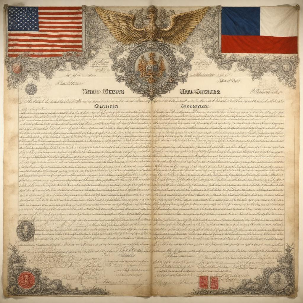 "Create an image of a historic document, specifically a large, ornate treaty, with multiple signatures and stamps, surrounded by flags of the Allied Powers, including the United States, United Kingdom, Soviet Union, and France, with a subtle background of a map of Europe, representing the Paris Peace Treaties, a formal agreement to end World War II with certain Axis powers, signed on February 10, 1947, and entered into force on September 15, 1947."